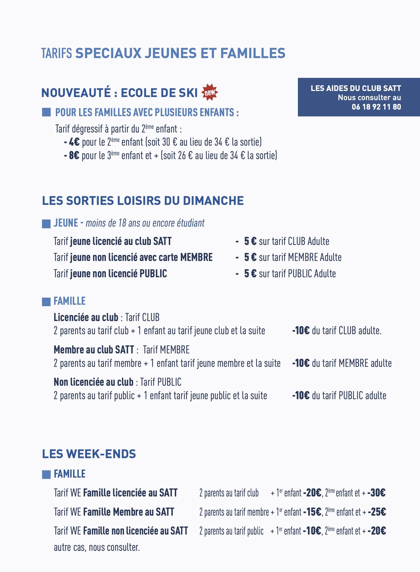 Tarifs spéciaux Jeunes et Familles Inscription Saison 2025/26 Tarifs des licences Tarifs spéciaux Jeunes et Familles Agenda des sorties Actualités du SATTSortie Raquettes Val-Thorens7 octobre 2025Le SATT vous propose une sortie skis et raquettes à Val Thorens le dimanche 30 novembre 2025. Les enfants accompagnés …+WEEK_END en MARS 20267 octobre 2025En décembre et janvier, nous avons fait 2 superbes WE de ski avec un temps magnifique et belle neige. Le …+WEEK-END Janvier 20267 octobre 20252 -ème WEEK-END: Janvier 2026 LE GRAND MASSIF EN HAUTE SAVOIE Samedi 17 et dimanche 18 Janvier 2026 Date …+Consulter toute l'actu