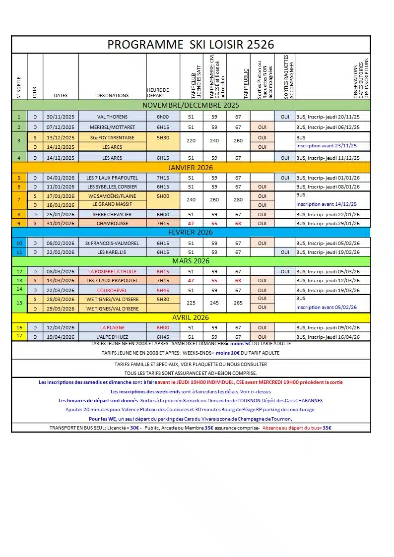Agenda 2025/2026 Qui sommes-nous ? Bureau et CA L’encadrement technique Règlement intérieur SATT magazine Agenda des sorties Actualités du SATTSortie Raquettes Val-Thorens7 octobre 2025Le SATT vous propose une sortie skis et raquettes à Val Thorens le dimanche 30 novembre 2025. Les enfants accompagnés …+WEEK_END en MARS 20267 octobre 2025En décembre et janvier, nous avons fait 2 superbes WE de ski avec un temps magnifique et belle neige. Le …+WEEK-END Janvier 20267 octobre 20252 -ème WEEK-END: Janvier 2026 LE GRAND MASSIF EN HAUTE SAVOIE Samedi 17 et dimanche 18 Janvier 2026 Date …+Consulter toute l'actu