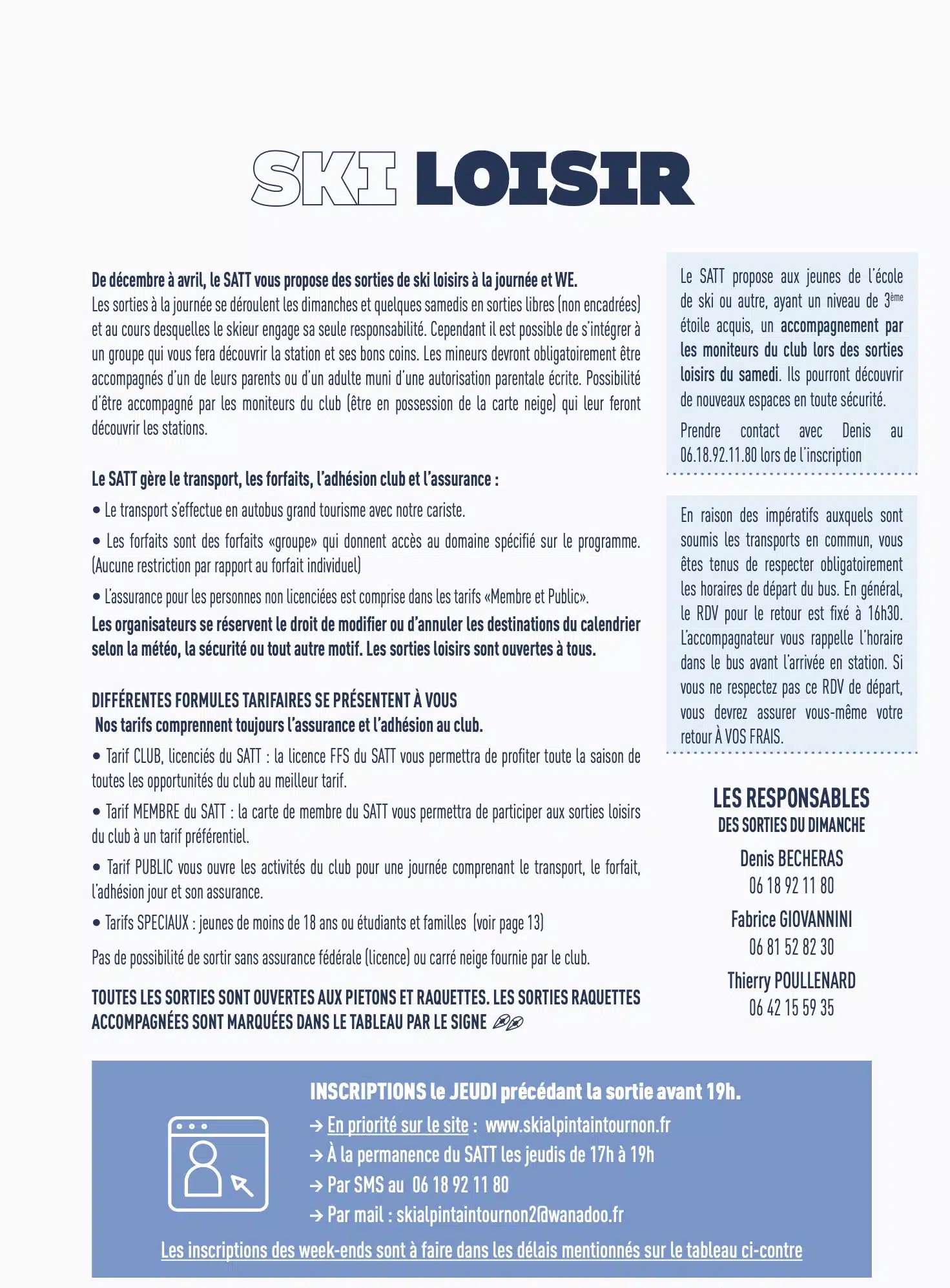 Sorties loisirs du dimanche et Week-Ends Ecole de Ski Fonctionnement ECOLE DE SKI Programme des sorties ECOLE DE SKI Réservation en ligne Ski Loisirs Fonctionnement SKI LOISIR Programme des sorties Réservation en ligne Compétition Agenda des sorties Actualités du SATTSortie Raquettes Val-Thorens7 octobre 2025Le SATT vous propose une sortie skis et raquettes à Val Thorens le dimanche 30 novembre 2025. Les enfants accompagnés …WEEK_END en MARS 20267 octobre 2025En décembre et janvier, nous avons fait 2 superbes WE de ski avec un temps magnifique et belle neige. Le …WEEK-END Janvier 20267 octobre 20252 -ème WEEK-END: Janvier 2026 LE GRAND MASSIF EN HAUTE SAVOIE Samedi 17 et dimanche 18 Janvier 2026 Date …Consulter toute l'actu